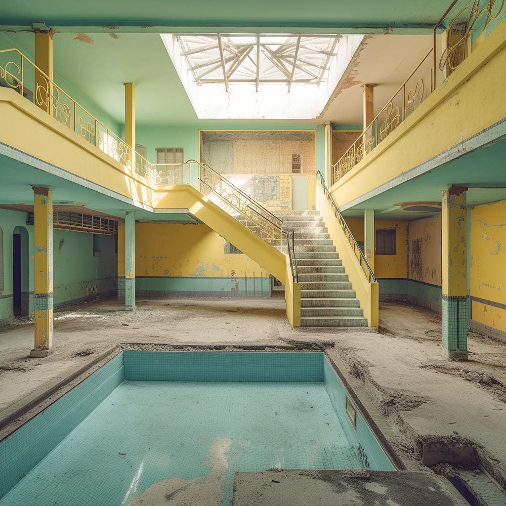 And that was the end of my involvement. Either she would be accepted to grad school or she wouldn’t. It was really no concern of mine. She was dead to me and I was happy to move on with my life. I made a point of deleting my YouTube watch history. No more Backrooms to nag me. I worked on my latest book. I worked on my golf swing and my tennis groundstrokes. I organized my sock drawer and rubbed my scalp with Minoxidil. I did some much-needed online shopping and wandered alone through halls and on Escher-like escalators in decaying light-industrial hellscapes.