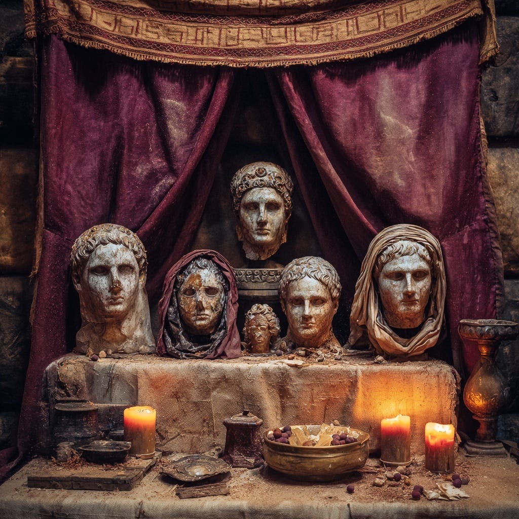 The heart of the traditional Roman house was the atrium, a sacred theater of lineage. Dominating this space were the imagines maiorum—wax death masks of the family’s ancestors—creating a tangible genealogy. Nearby stood the lararium, the household shrine, where daily rituals were performed to the Lares, the Penates, and the Genius of the family. This was the focal point for venerating the familial dead, the di parentes, who were considered part of the household’s divine community.